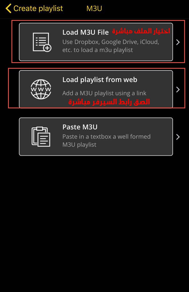 7- سوف اختار اضافة ملف m3u قم بتحميله الي الجهاز كما في الصورة الاتية :